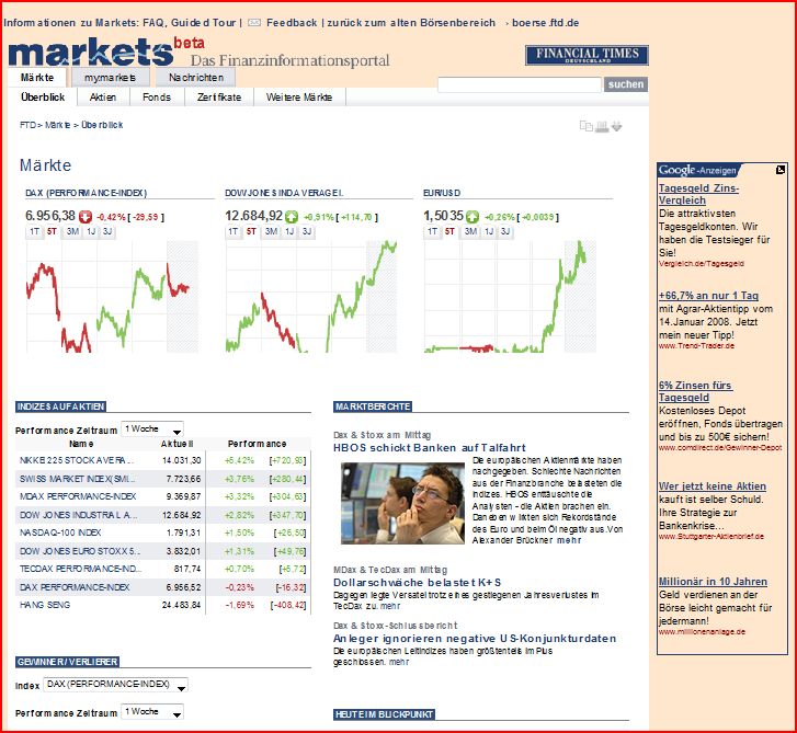 Nach monatelanger Programmierarbeit, intensiven Optimierungsrunden und massiven Investitionen in neue Technik ist markets.ftd.de nun reif für die Öffentlichkeit. Die Website bietet eine völlig neue Art, Daten, Informationen und Einschätzungen über das Geschehen auf den Finanzmärkten zu präsentieren.