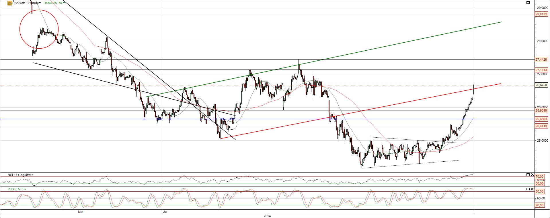Nach wochenlangen Verlusten zeigt sich bei der Aktie der Deutschen Bank nun endlich eine brauchbare Wendeformation. Die Aktie dürfte den aufwärts gerichteten Trendkanal nun wieder aufnehmen.