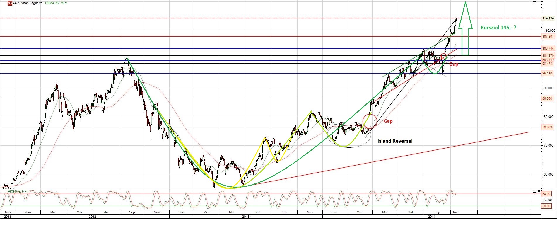 Die Apple Aktie ist dynamisch aus dem Aufwärtstrend-Kanal nach oben ausgebrochen. Rein rechnerisch ergeben sich nun Kursziele um die 146,- Dollar aus dieser Chartformation