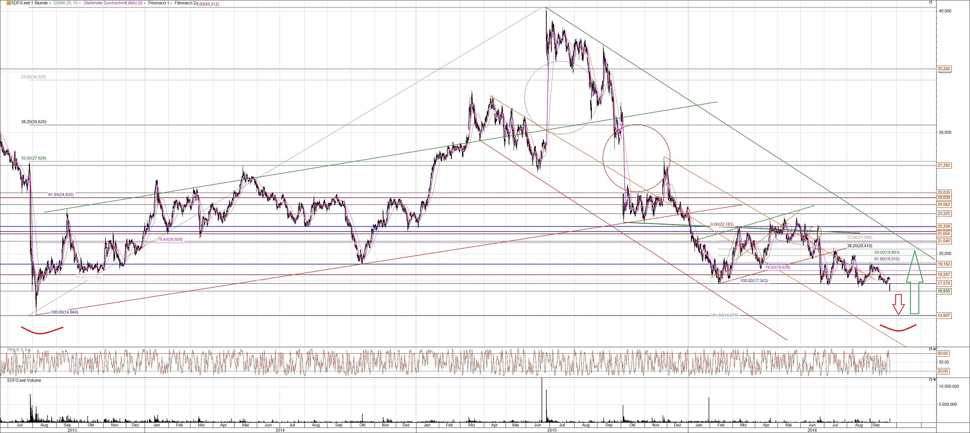 Grund für den heutigen Kursrutsch dürften die letzten – sehr negativen – Analysenkommentare gewiesen sein. Nachdem sich zuletzt die HSBC deutlich negativ zu dem Titel geäussert hatte verpasste auch die Deutsche Bank dem Düngemittelhersteller heute ein „Sell“ Rating. Das Kursziel sehen die Bänker jetzt nur noch bei 14,- Euro, was sich ein wenig mit dem deckt, was ich hier vor Kurzem über die Aktie geschrieben habe. Ich persönlich gehe immer noch davon aus, dass das signifikante Tief, nach dem großen Abverkauf im Jahr 2013 noch einmal getestet werden könnte. Hier wäre dann ein möglicher, großer Doppelboden zu finden. Das Kursziel liegt also nach meinem Dafürhalten eher im Bereich um die 15,- Euro als bei 14,- Euro.